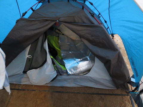 さらにエマージェンシーブランケットを棺桶テントの上から掛け、シュラフの中には湯たんぽを入れています。