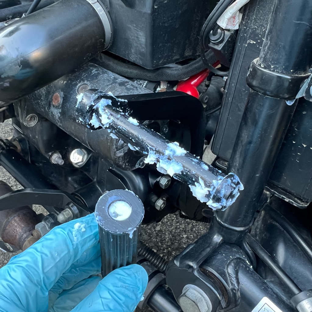 新しいゴムの取付はキックスターターに差し込むだけなんですが、冬場でもあり普通に挿しただけでは固くて取り付けられませんでした。