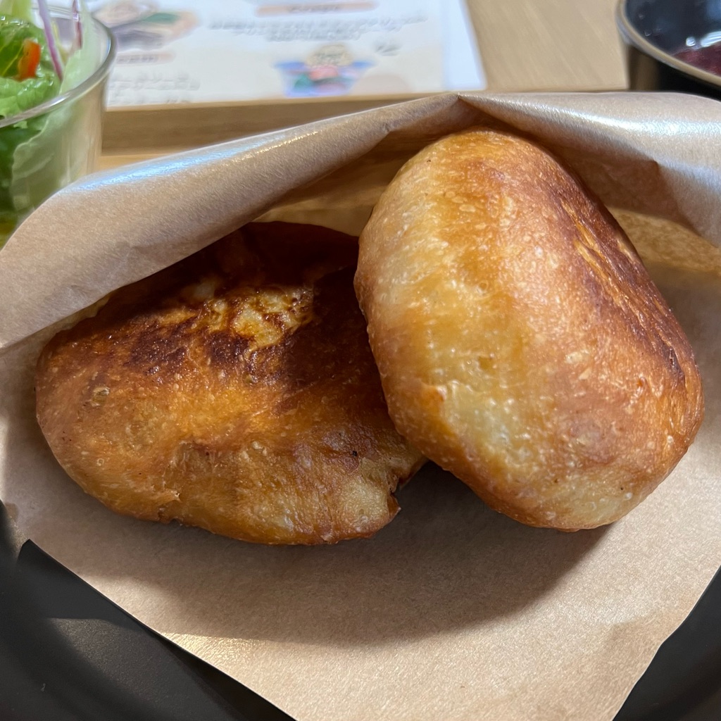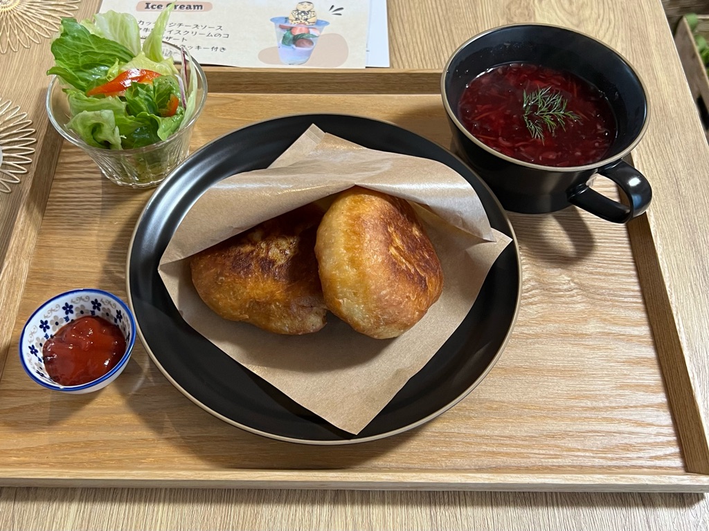 ピロシキ2個とサラダ、日替わりスープが付きます。