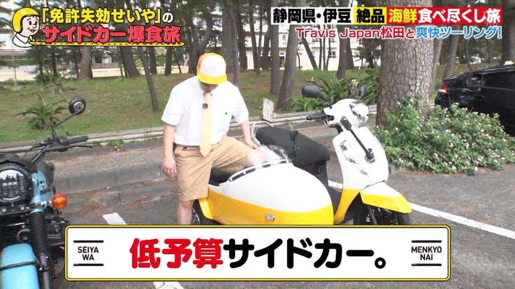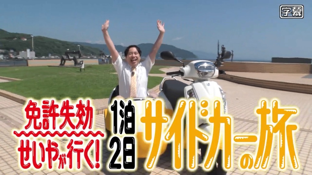 運転免許失効中の #せいや(#霜降り明星) が街の方々に声をかけ目的地まで乗せてもらって旅をする「サイドカー旅番組」です🚩