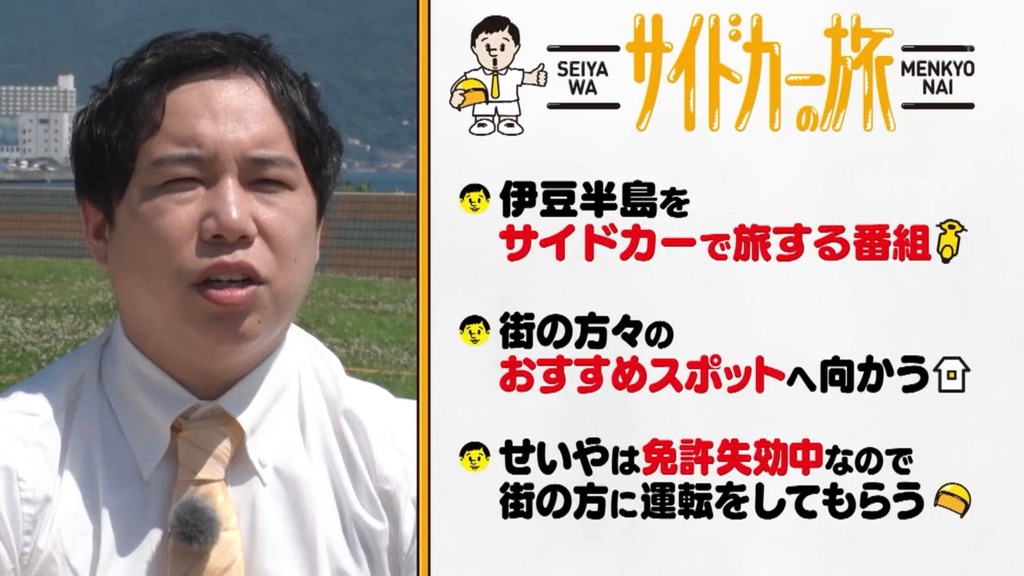 この番組は、免許失効中で運転出来ないせいやさんに代わって街の人にサイドカーを運転してもらって、お勧めの場所を巡ると言う「サイドカー旅番組」。