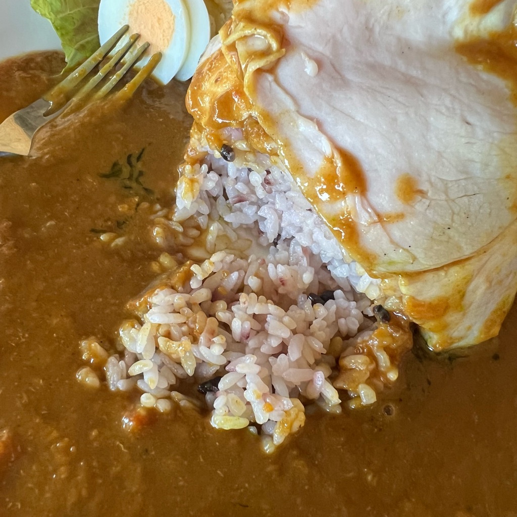 ローストポークがたっぷり載ったご飯にピリ辛カレーが掛かっています。