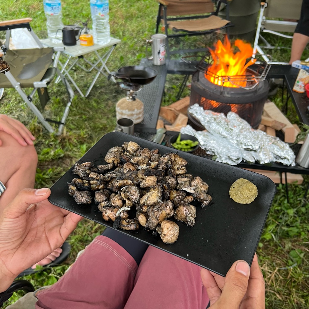 宮崎名物地鶏の炭火焼きをキャンプの焚き火で完全再現するヂロー師匠。