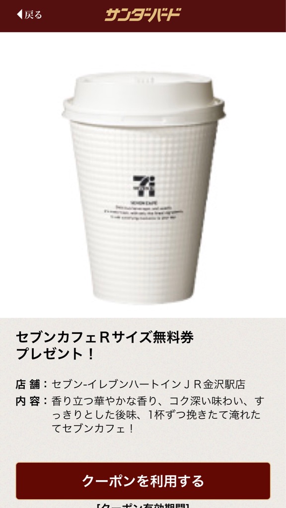セブンイレブンハートインJR金沢駅店ではセブンカフェRサイズが無料。