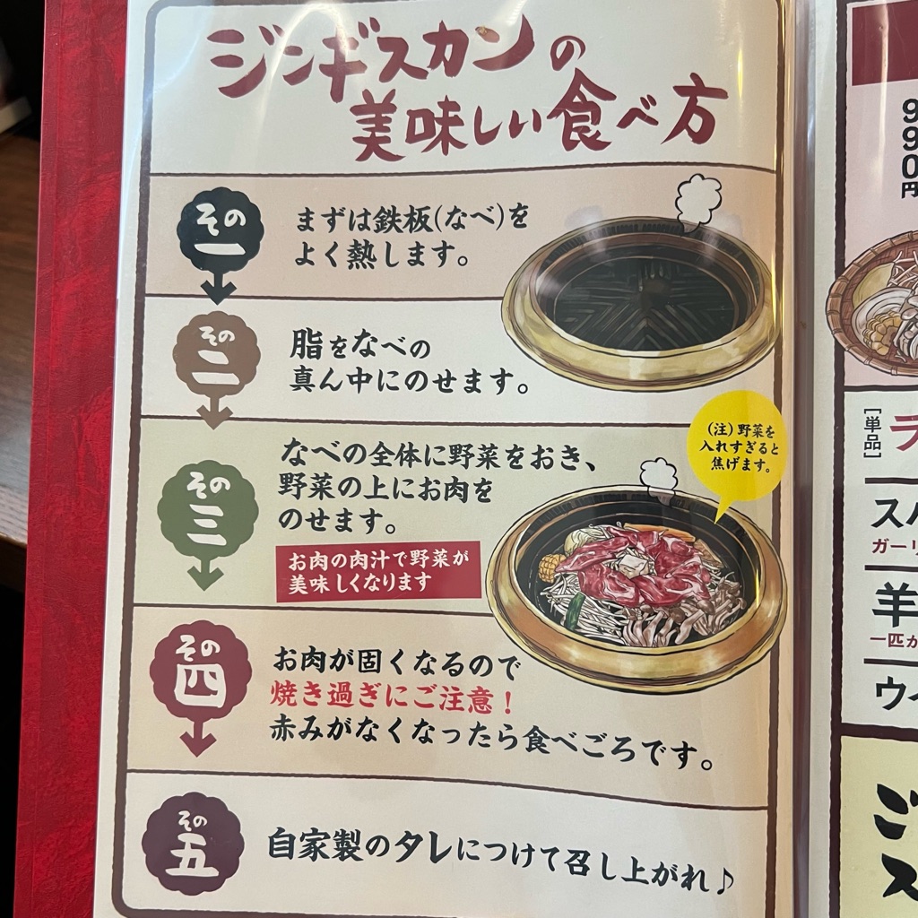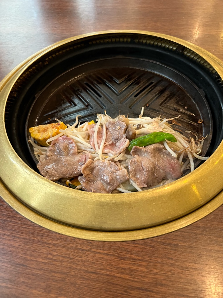 普通ジンギスカンでは野菜は鍋の端に並べ中央に肉を置くのですが、こちらのお店では野菜を敷いた上に肉を載せるようです。
