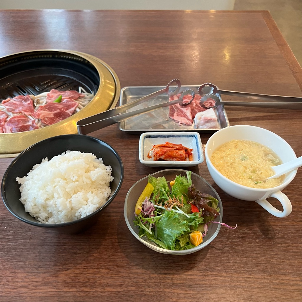 羊苑セットにはサラダ、ライス、スープ、キムチが付きます。